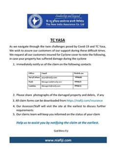 As we navigate through the twin challenges posed by Covid-19 and TC YASA, We wish to assure our customers of our support during these difficult times. We request all our customers insured for Cyclone cover to note the following, in case your property has suffered damage during the cyclone Immediately notify us of the claim on the following contacts